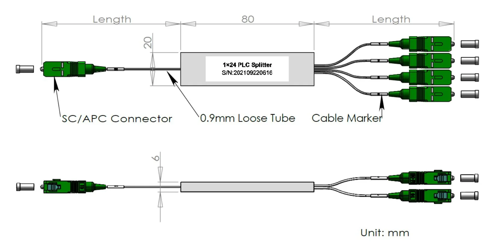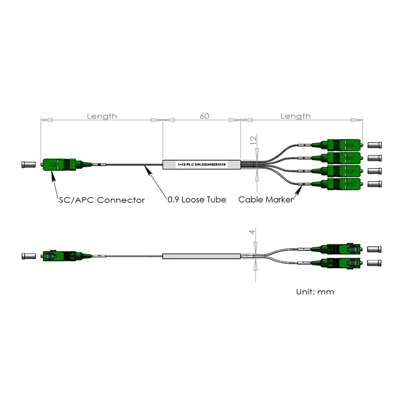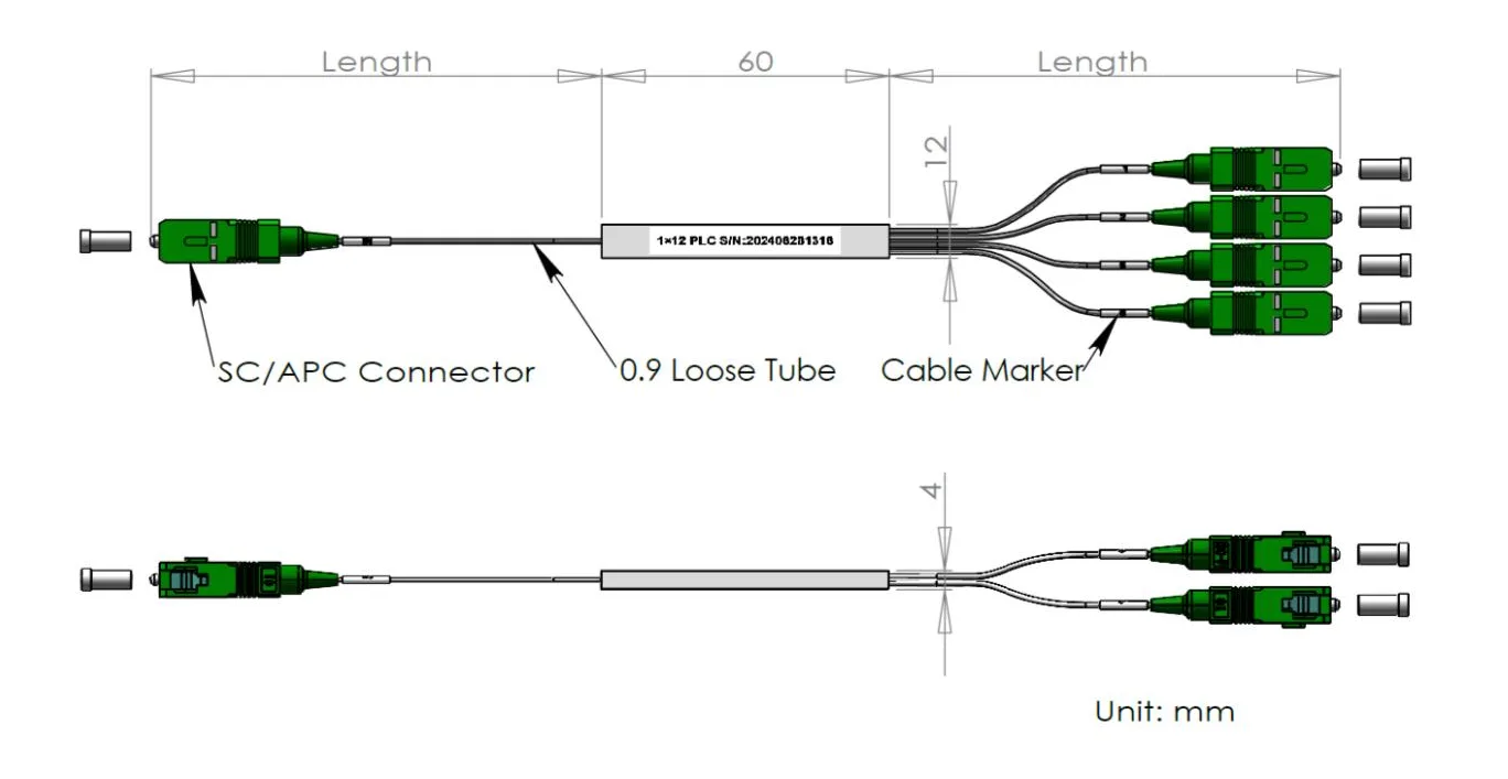 1x12/1 × 24 PLC splitter steel tiub Pakej 60x12x4 dan 80x20x4mm, dengan 900μm tiub longgar 1.0+0.1/-0m, penyambung SC/APC.